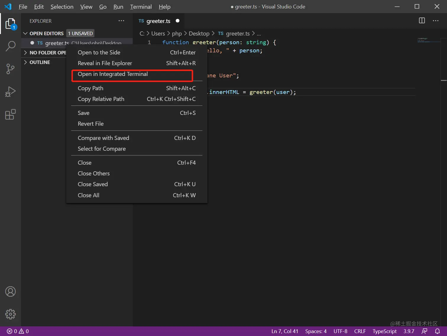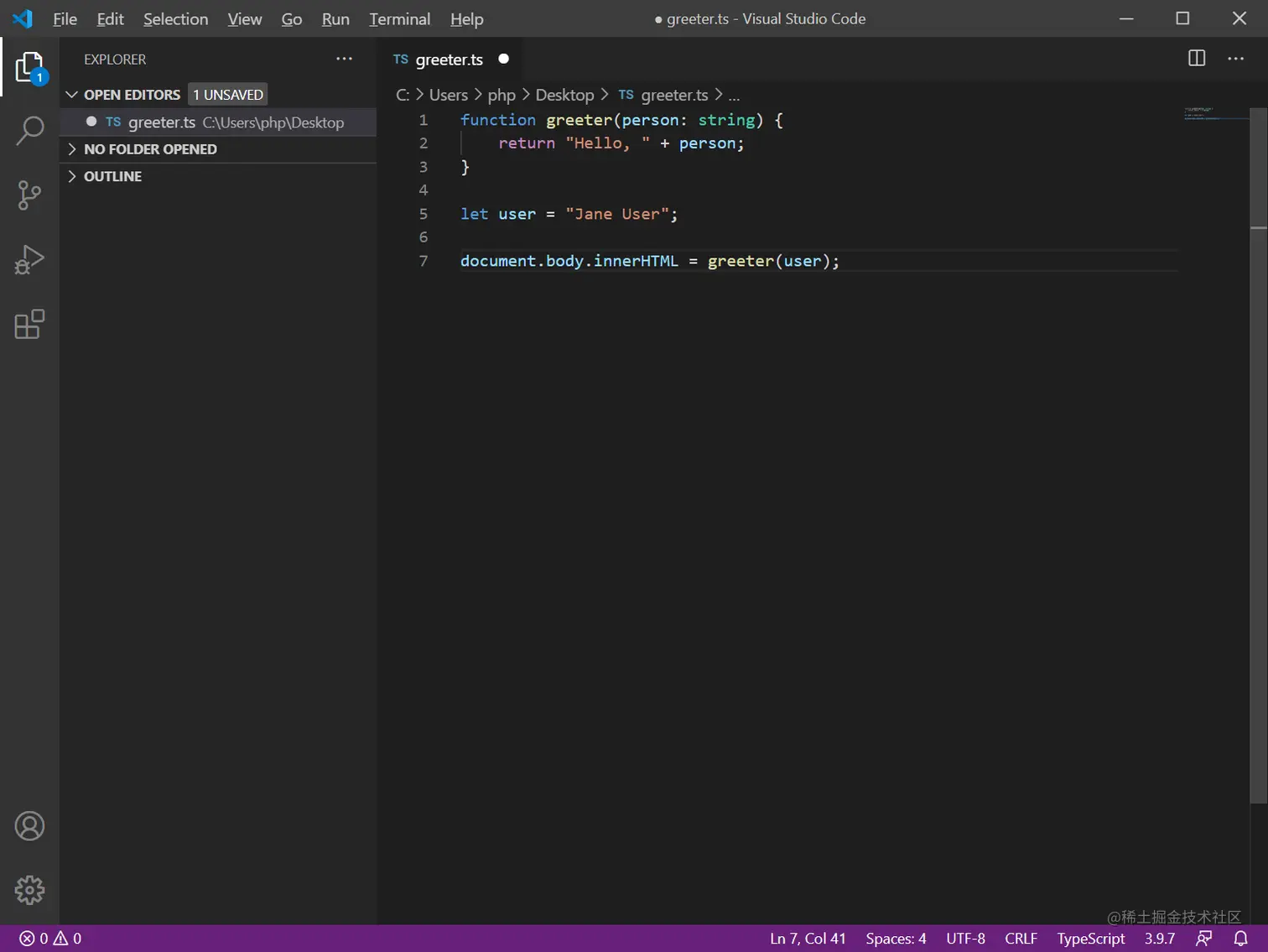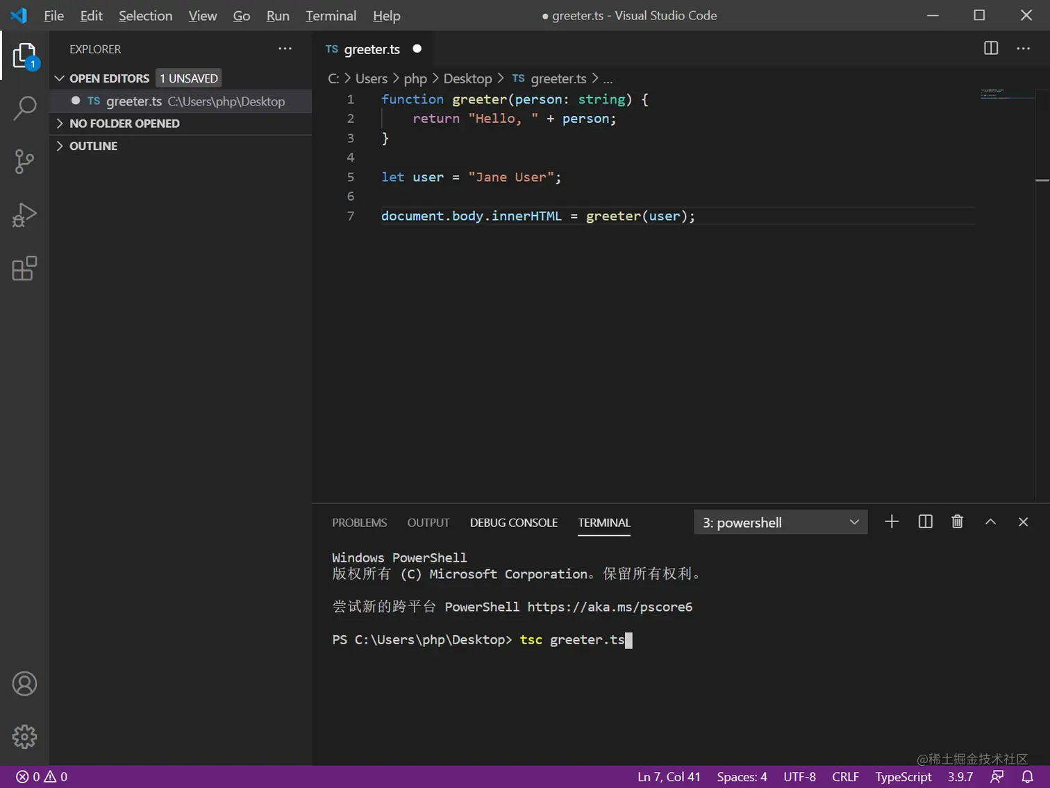 (1)首页创建TypeScript文件greeter.ts,将下列代码输入到该文件中(注:通常我们使用 .ts 作为 TypeScript 代码文件的扩展名):