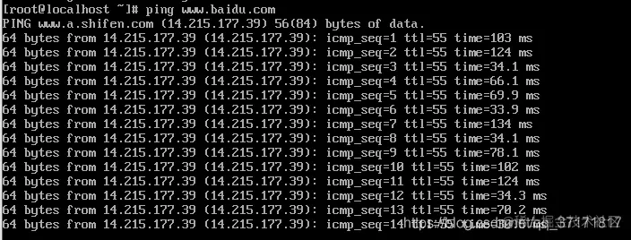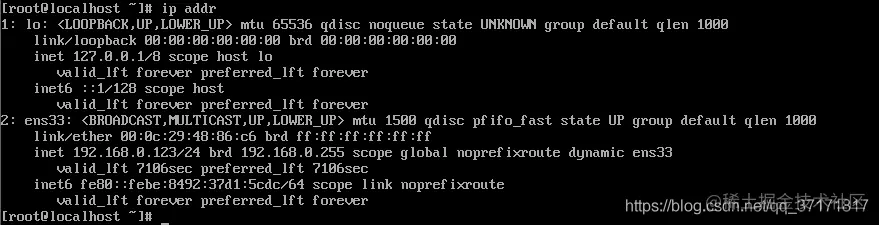 ens33中,inet后的ip地址即为当前虚拟机ip地址。