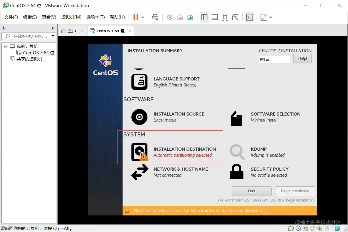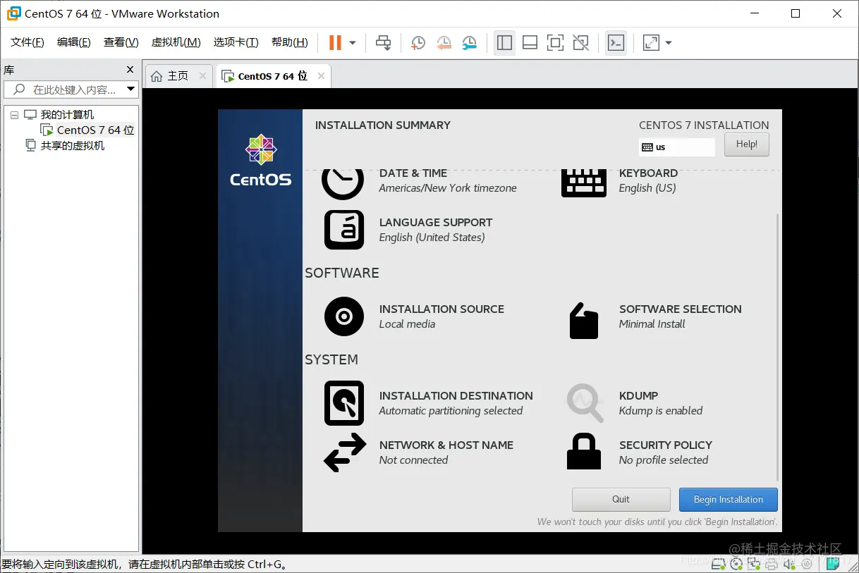 此时Begin Installation(开始安装)按钮为可点击态,点击它,开始安装。