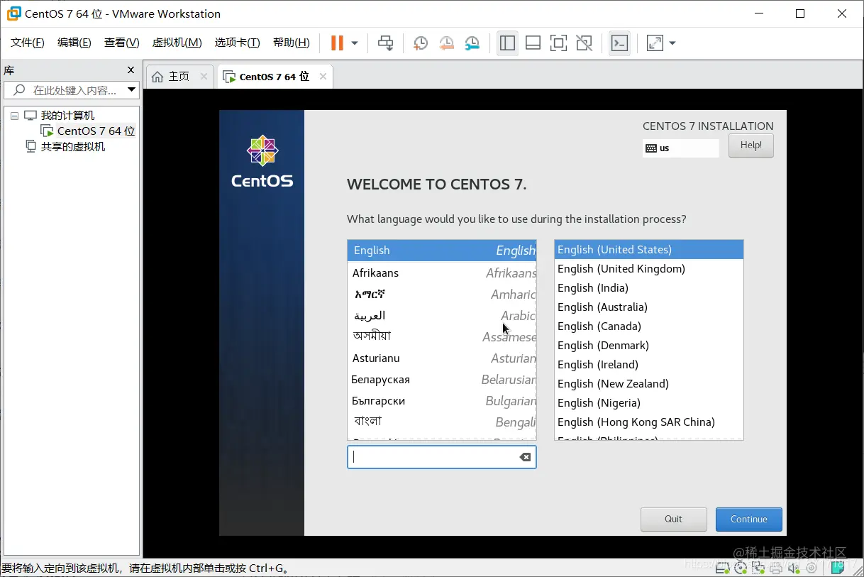 此时正在执行安装,鼠标点击进虚拟机界面,按上键选中Install CentOS 7,按下回车。