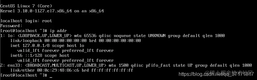 输入ip addr,发现ens33没有inet属性,那么就无法通过ip地址链接虚拟机。需要查看并编辑ens33配置。