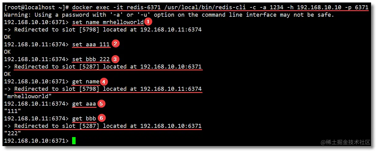 docker exec -it redis-6371 /usr/local/bin/redis-cli -c -a 1234 -h 192.168.10.10 -p 6371