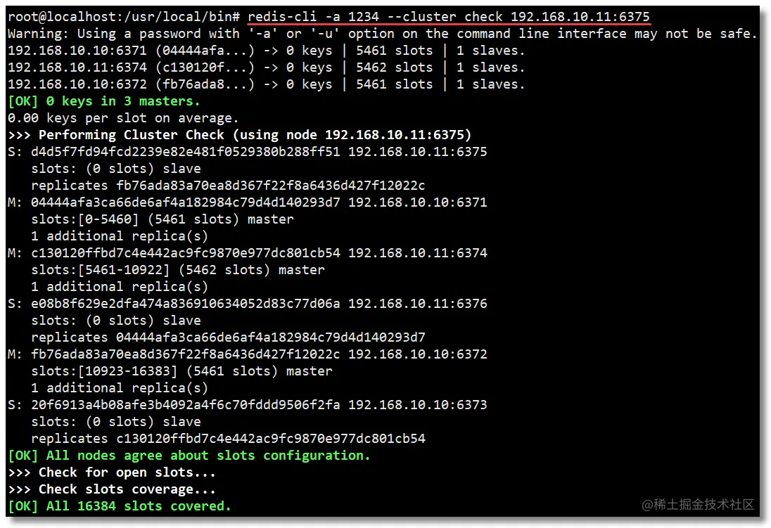 redis-cli -a 1234 --cluster check 192.168.10.11:6375