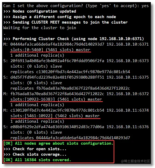 root@localhost:/usr/local/bin# redis-cli -a 1234 --cluster create 192.168.10.10:6371 192.168.10.10:6372 192.168.10.10:6373 192.168.10.11:6374 192.168.10.11:6375 192.168.10.11:6376 --cluster-replicas 1