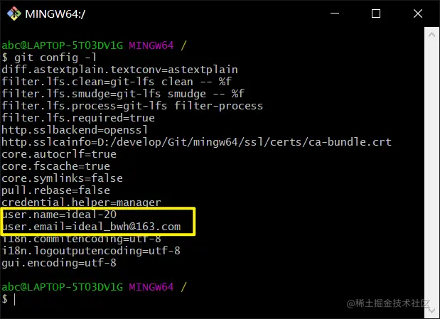 Git 有两种配置文件,一种是系统级别的配置文件,还有一种是用户级别的配置文件,且这两者都存储在本地上,先看一下如何显示所有配置文件内容(注:下面是小写 L 不是数字1或者 大写 i)