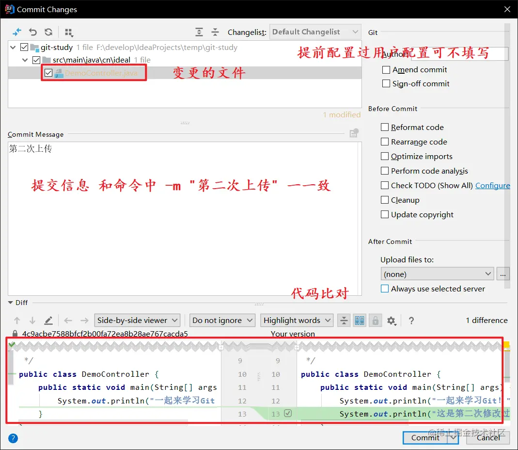 这个界面,会显示变更的文件,以及让你输入需要上传的提交信息,如果你之前已经配置过用户级别的配置信息,不填写个人信息也行,下面是代码的比对,右侧默认勾着一些检查的勾选,会增加一些时间,也可以全部取消勾选