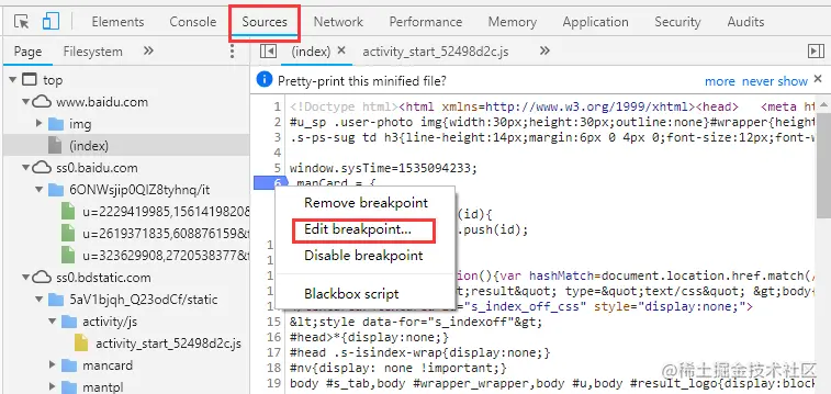 在源代码左边有行号,点击对应行的行号,就好给改行添加上一个断点(再次点击可删除断点)。右键点击断点,在弹出的菜单中选择 Edit breakpoint 可以给该断的添加中断条件。