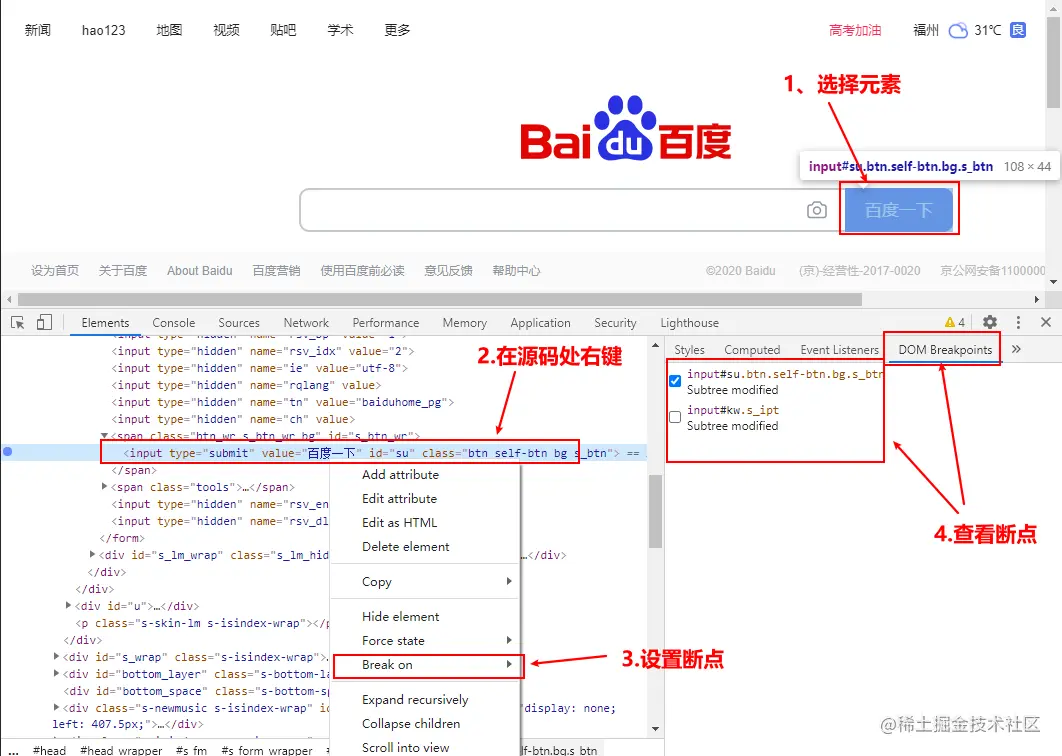 在元素的右键菜单中选择断点选项(Break on…),选中之后,当元素被修改(通常是被 JS 代码修改)时,页面加载会暂停,然后可以查看该元素的属性。元素断点添加之后,可以在右侧栏的 DOM Breakpoints 页面中看到,这个页面可以看到当前网页的所有元素断点。