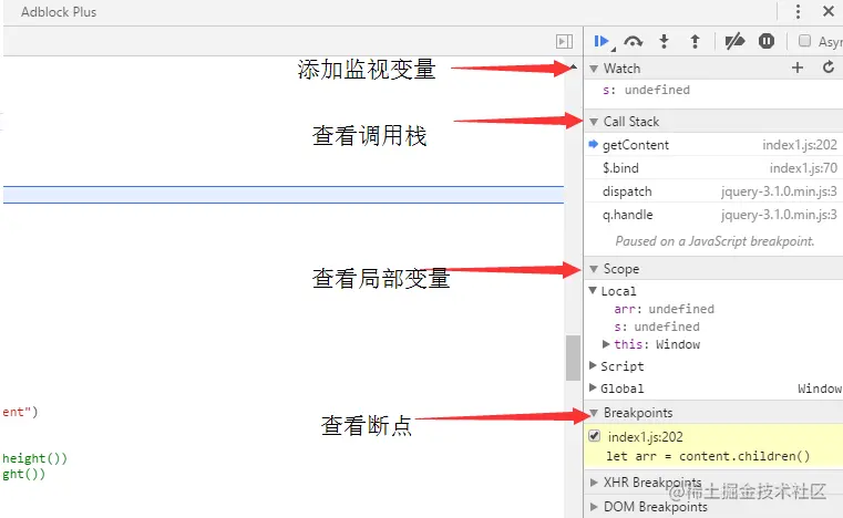 添加断点后,当 JS 代码运行到断点时会中断(对于添加了中断条件的断点在符合条件时中断),此时可以将光标放在变量上查看变量的
