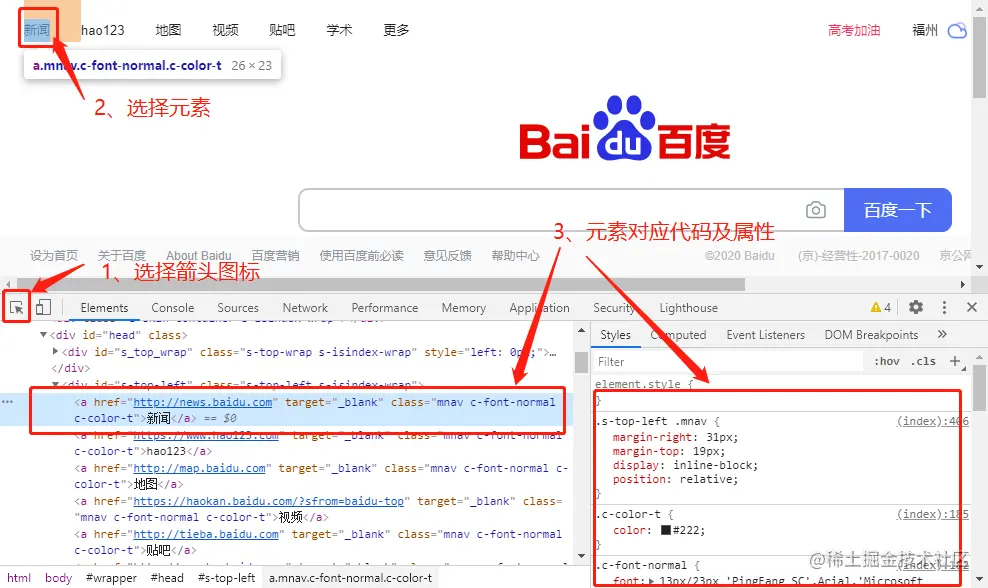查看元素的属性:定位到元素的源代码之后,可以从源代码中读出改元素的属性。