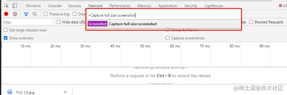 F12 或 Ctrl+ Shift+ I 打开开发者工具,在任意 tab 上按 Ctrl+ Shift+ P,在弹出的输入框里输入 Capture full size screenshot(其实不需要输入完整,可以自动补全),然后按回车即可