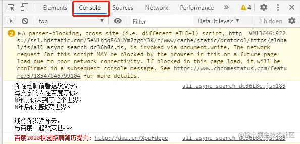当网页的 JS 代码中使用了 console.log()函数时,该函数输出的日志信息会在控制台中显示。日志信息一般在开发调试时启用,而当正式上线后,一般会将该函数去掉