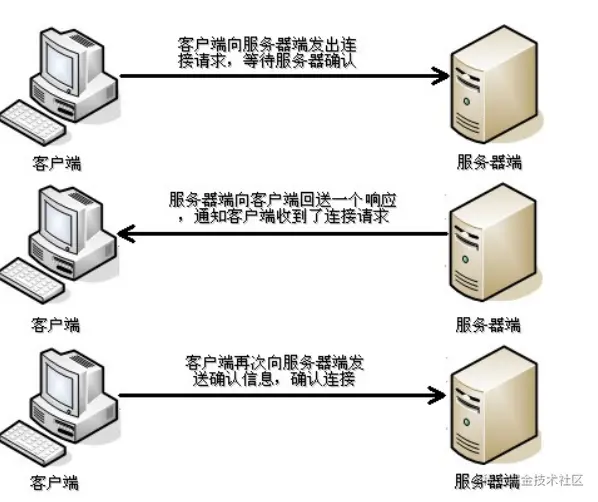 - 第三次握手,客户端再次向服务器端发送确认信息,确认连接。整个交互过程如下图所示。