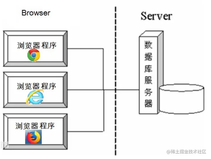 B/S结构:全称为Browser/Server结构,是指浏览器和服务器结构。常见浏览器有谷歌、火狐等。
