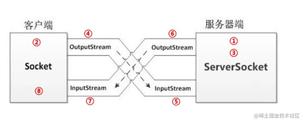 java.net.Socket类表示。创建Socket对象,向服务端发出连接请求,服务端响应请求,两者建立连接开始通信。 - 服务端: