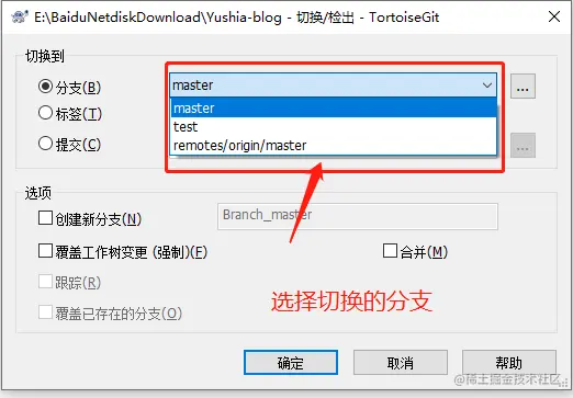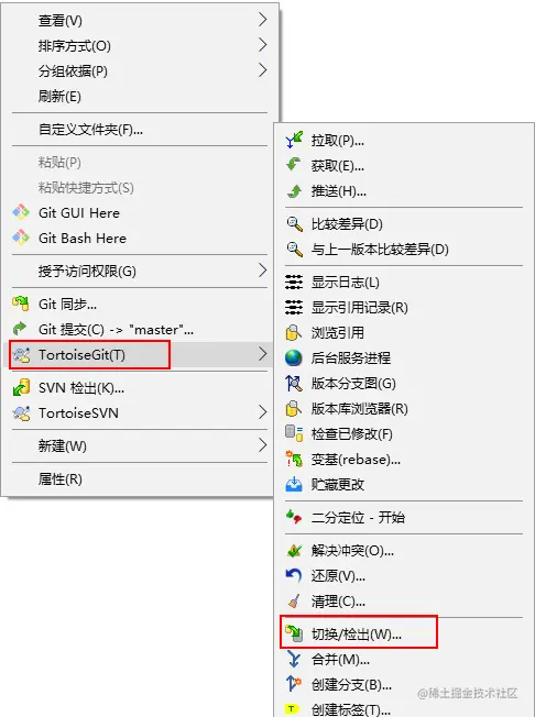 在本地仓库文件夹上【右击鼠标】→【Tortoisegit】→【切换/检出】 :