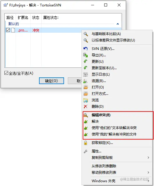 如果服务器上的文件被修改过了(本地文件修改前不是最新版本),就会提示冲突。先要解决冲突,然后再提交结果: