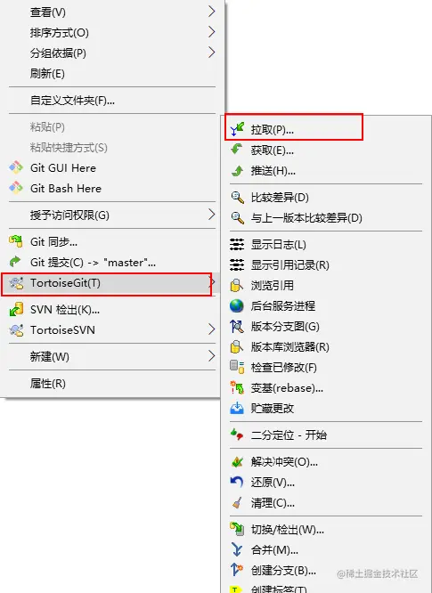 在本地仓库文件夹上【右击鼠标】→【Tortoisegit】→【拉取】 :