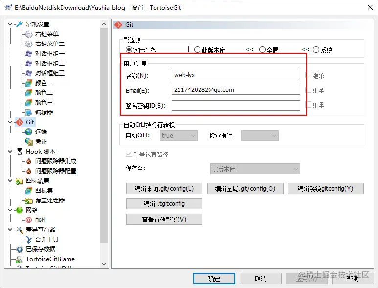 用户作为你操作 git 的个人标识,进入设置,点选左边的 Git 标签,可以发现,右边可以配置用户的名字与 Email 信息