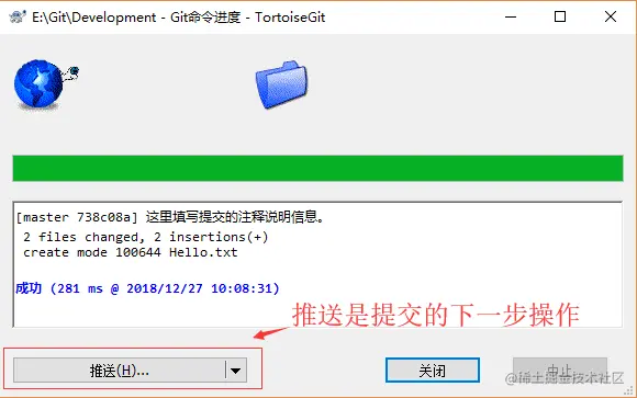弹出提交进度窗口,提交成功后还需要“推送”将本地仓库的修改推送到远程仓库: