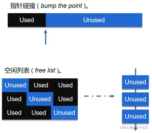 如果 Java 堆是规整的:已分配的地址在指针一侧,未分配的地址在指针另一侧,那么分配内存时仅仅需要将指针向着未分配地址的方向挪动即可。这种分配方式称之为 "指针碰撞" ( Bump the Pointer) 。