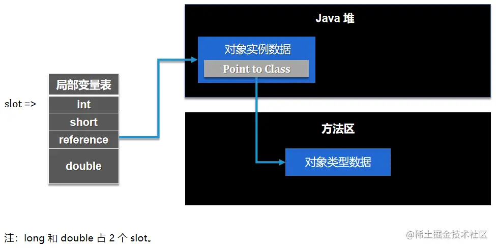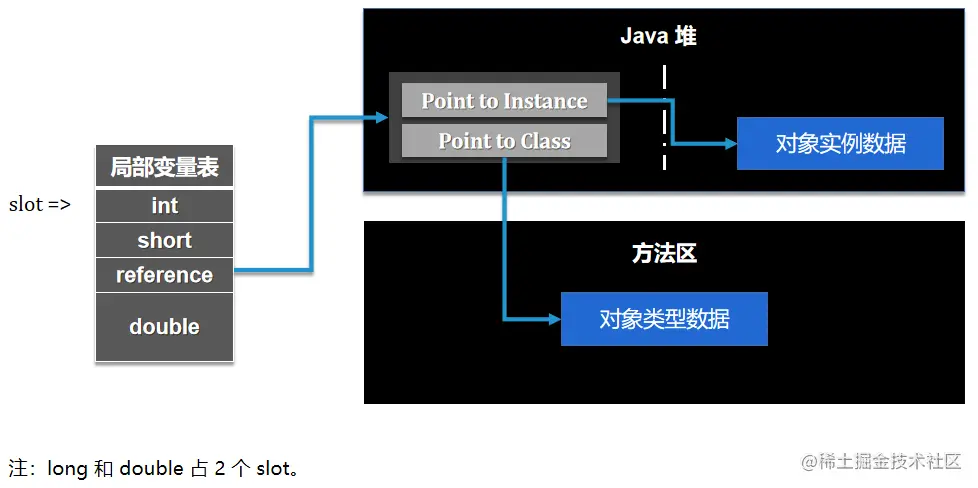 栈帧内的本地变量表有一个 reference 数据来指向堆内存中的具体对象。《Java 虚拟机规范》 并没有严格规定 reference 应具体以什么样的方式去定位,因此衍生出了两种方式: