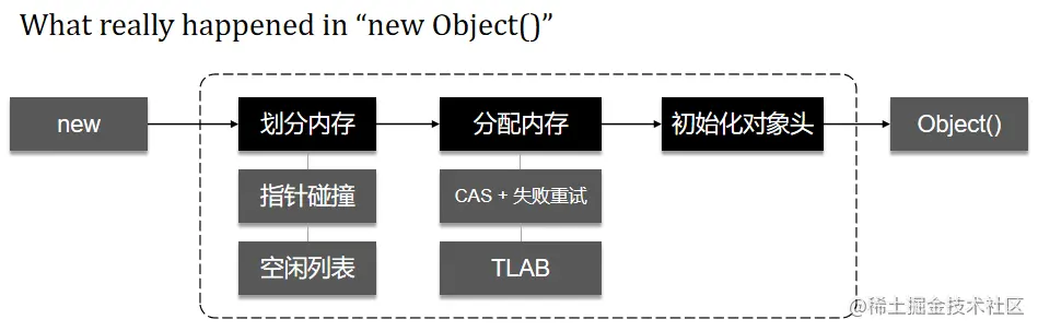 遇到 new 指令时,虚拟机会先尝试去常量池(位于方法区内)中搜索到该类的符号引用,并检查它引用的类是否被加载,解析过(这里假定类已经被解析过,类解析的细节在后续的章节再提及)。在类加载完成之后,创建对应对象所需的内存便完全确定了,虚拟机会将已经确定好的内存空间划分出去。