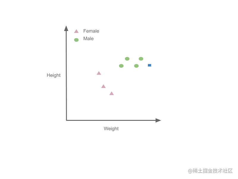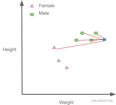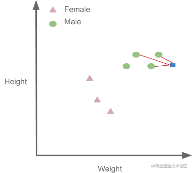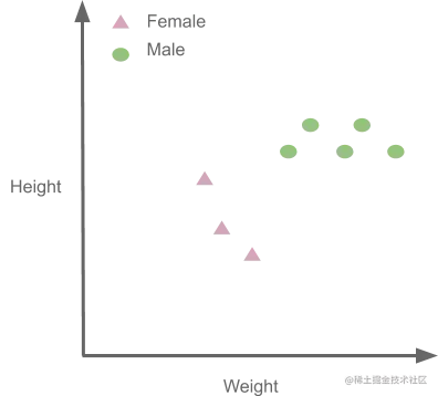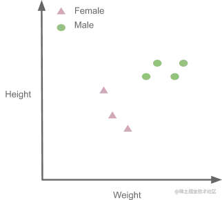 现在让我们看看如何使用K-NN进行分类。这里是一个假设的数据集,它试图根据身高和体重(特征)来预测一个人是男性还是女性(标签)。