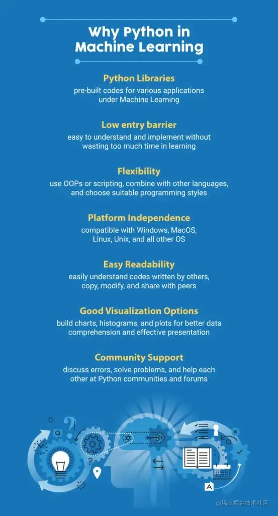 与其他编程语言相比,Python以其可读性和相对较低的复杂性而闻名。机器学习应用程序涉及复杂的概念,例如微积分和线性代数,这些实现需要花费很多精力和时间。Python通过快速实施来帮助机器学习工程师验证想法,从而减轻了负担。