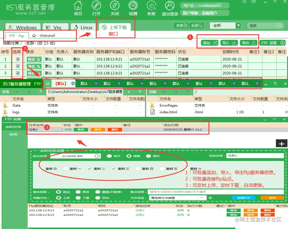 IIS7服务器管理工具可以批量管理、定时上传下载、同步操作、数据备份、到期提醒、自动更新。IIS7服务器管理工具适用于Windows操作系统和liunx操作系统;支持Ftp客户端批量操作。