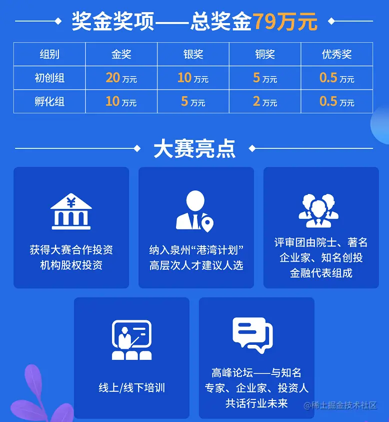 第一重,奖金。本次大赛设立总奖金共79万元。孵化组、初创组分别设立金奖1名、银奖2名、铜奖3名、优秀奖4名,共20个获奖项目。