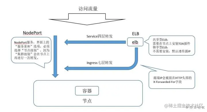 ELB:ELB访问方式,是通过华为云ELB产品来实现负载均衡,“服务亲和”也是需要选择“节点级别”,其中“共享型”ELB需要在节点安装TOA插件,而“独享型”ELB默认透传源ip,不需要安装TOA插件。