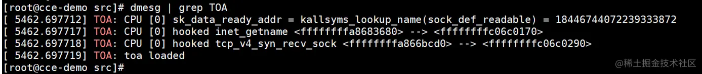 若提示信息包含“TOA: toa loaded”,说明内核模块加载成功。