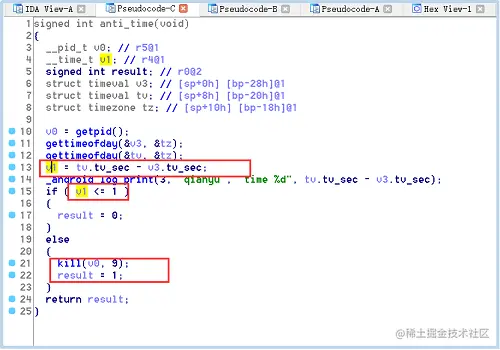 11.获取两个间隔做差值放到v1寄存器,然后继续if判断,小于零则给上一层的if返回0,反之,直接kill,返回1,如下图所示。