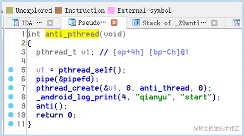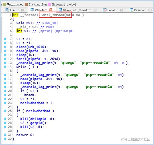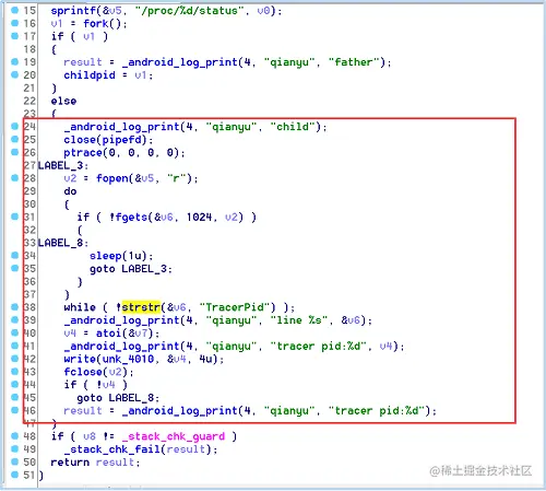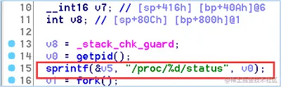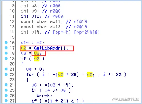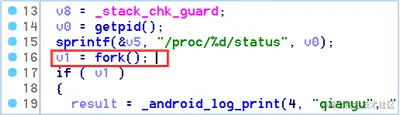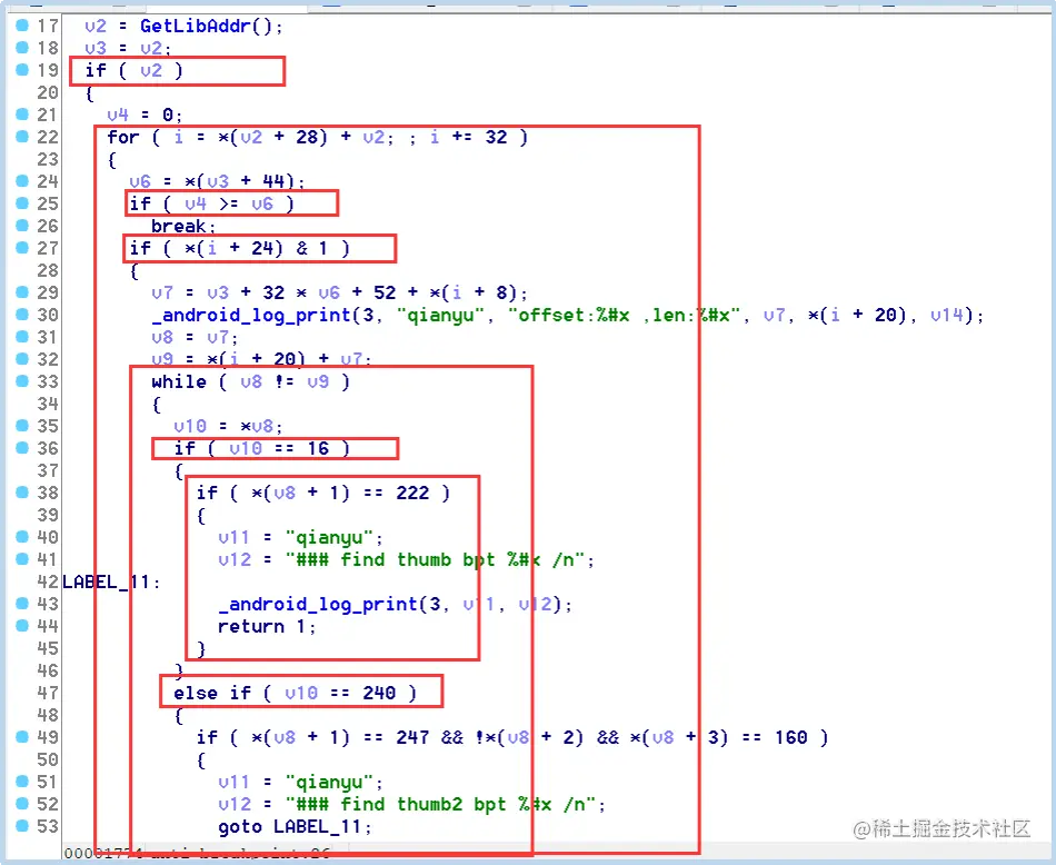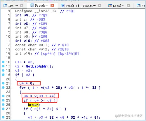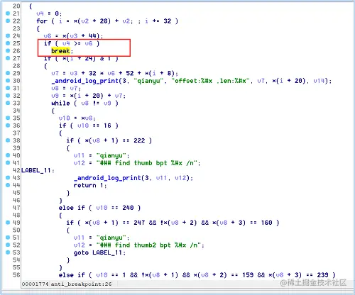 19.回到break的判断,v4固定值0,v6是一个返回值+44,然后整体取地址,这个肯定是大于零的(因为地址不可能是负数),也就是说,这个if判断永远小于零,break永远不会执行。