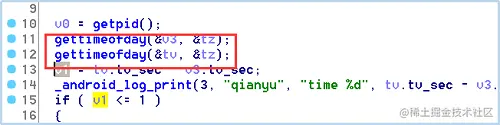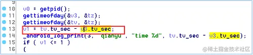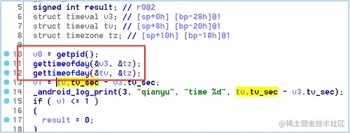 6.先获取线程ip给v0,前面两个gettimeofday的函数,传入两个值进行操作,如下图所示。