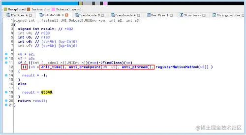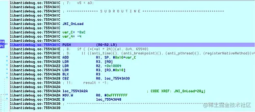 1.在jni_onload处下断点,然后运行到此处,如下图所示。