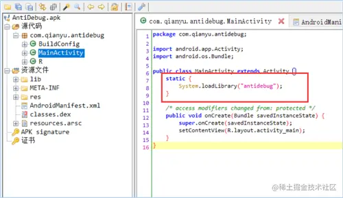 1.将文件拖入jdax-gui中,进行静态分析,会发现OnCreate里面没多少内容,并且上面加载了so库,如下图所示。