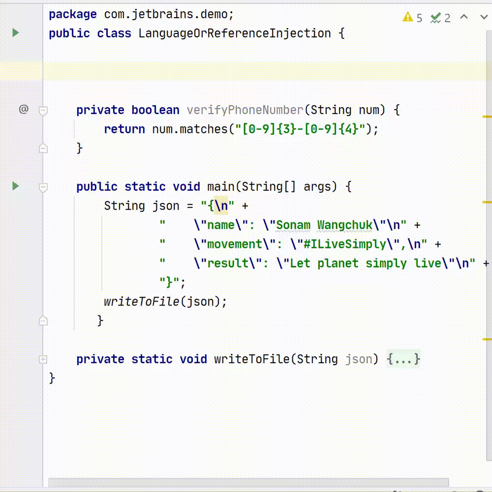 为 String(普通或文本块 java13)的文本值中注入语言或引用,值校验、语法高亮和建议。
