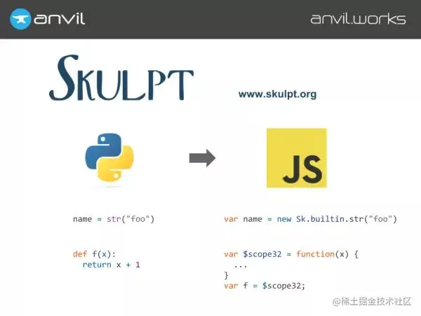 Skulpt 是 Python 的浏览器版实现,可以被添加到 HTML 代码中。此 Python 编译器使用 Javascript 编写,在客户端运行代码,无需其它插件、加工或服务器支持。Skulpt 解释器通过导入方式,来执行保存在网站上的 .py 文件中的代码。