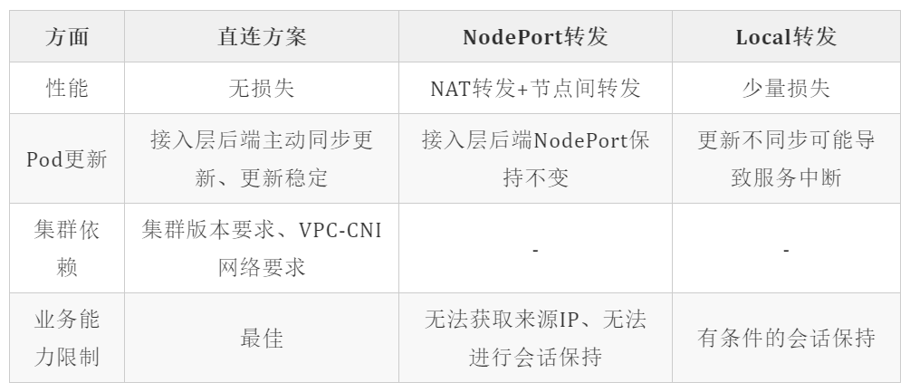为了解决以上问题,我们以前给用户提供的技术建议主要是通过Local转发的方式,避免KubeProxyNAT转发带来的问题。但是因为转发的随机性,一个节点上部署多个副本时会话保持依旧无法支持。而且Local转发在滚动更新时,容易出现服务的闪断,对业务的滚动更新策略以及优雅停机提出了更高的要求。我们有理由去寻找更好的方案解决这个问题。