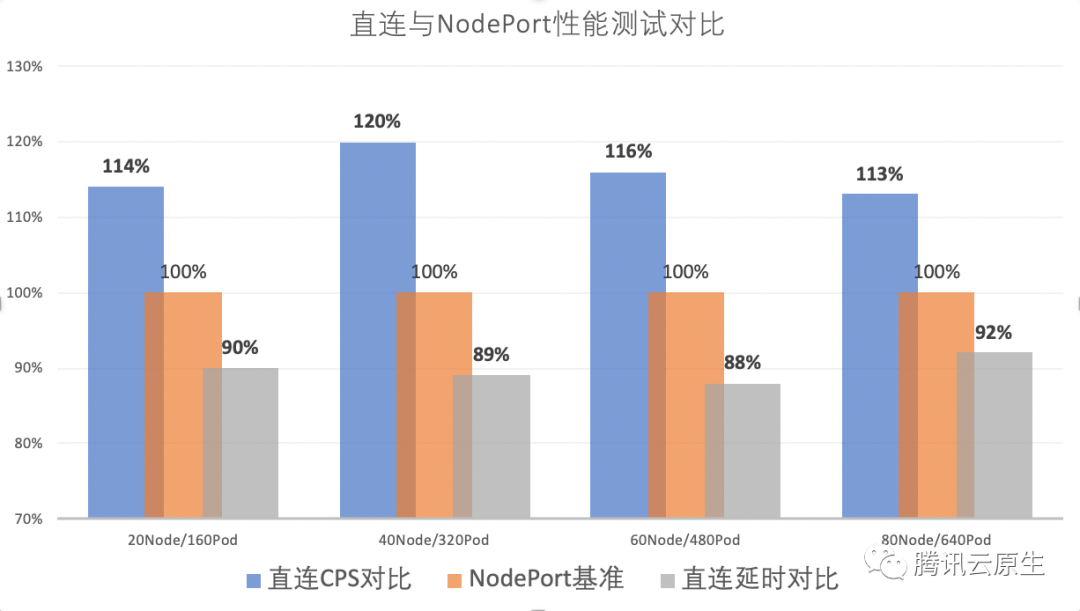 直连与NodePort是服务应用的接入层方案,其实最终参与工作的还是用户部署的工作负载,用户工作负载的能力直接决定了业务的QPS等指标。所以我们针对这两种接入层方案,在工作负载压力较低的情况下,重点针对网络链路的时延进行了一些对比测试。直连在接入层的网络链路上能够优化10%左右的时间。同时测试中的监控也发现,直连模式减少了大量VPC网络内的流量。测试场景,从20节点到80节点,逐步增大集群规模,通过wrk工具对集群进行网络延时的测试。针对QPS和网络时延,下图给出了直连场景与NodePort的对比测试。