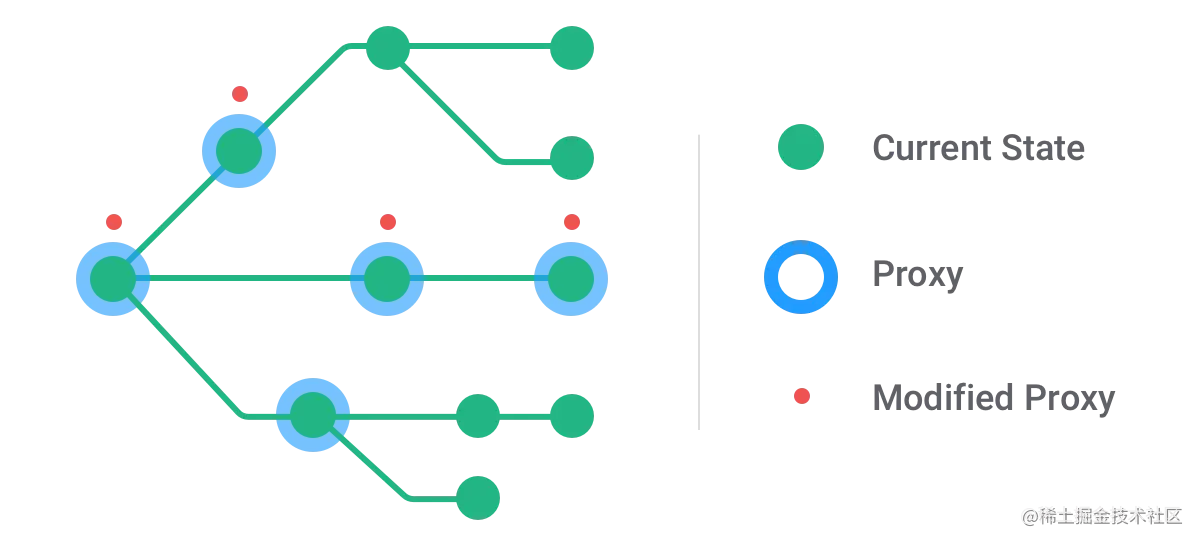 最后会遍历整个proxy树,被修改的地方返回他的拷贝值,未被修改的地方返回原值,这就是他的一个核心理念 ** 结构共享**。