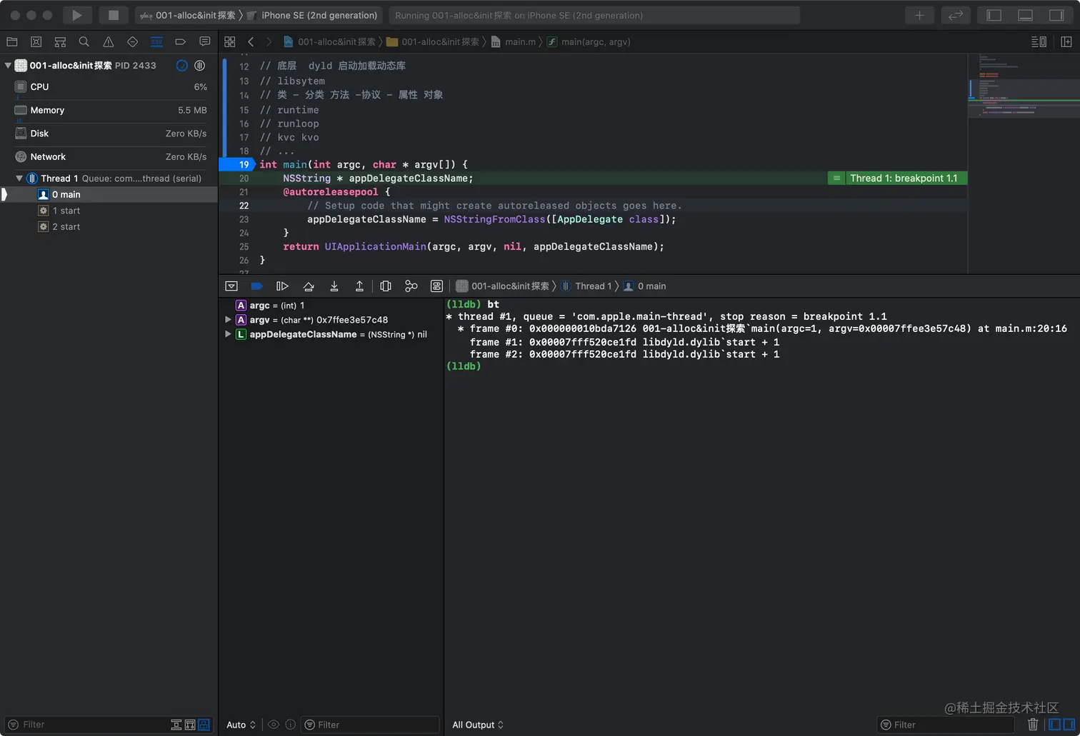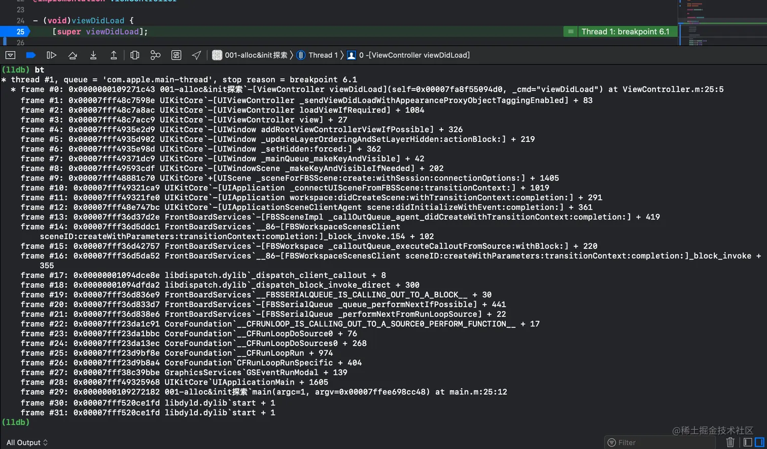 首先作为 iOS 开发者,我们都知道新建一个工程,首先进入的就是 main 函数,那我们就在此处下个断点,然后使用在控制台使用 bt 查看下调用栈,如下: