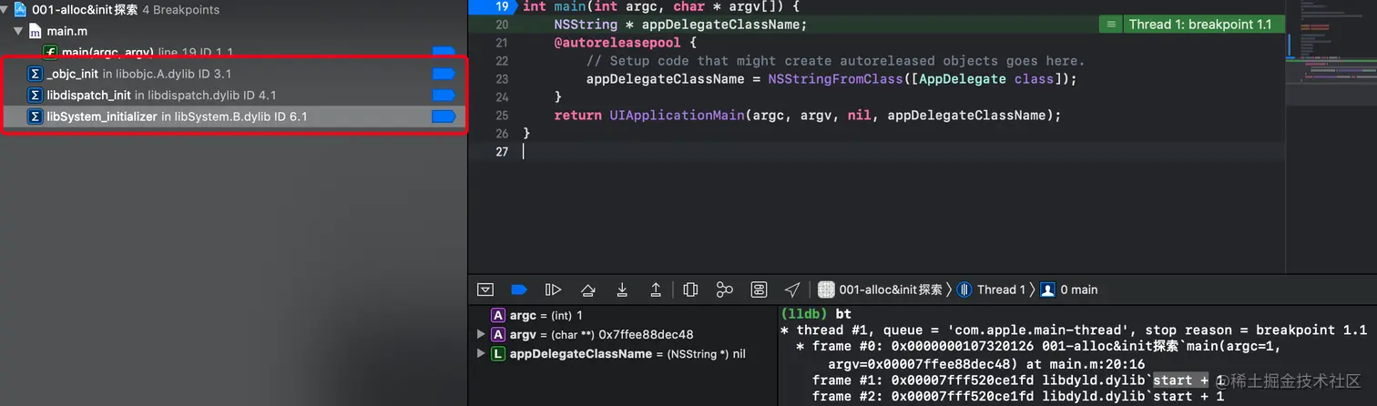 我们发现在 main 函数之前系统还做了一些其他的事,可以看到两次 start 的调用,其位于 libdyld.dylib 底层库,为了进一步了解,我们来插入 _objc_init、libdispatch_init、libSystem_initializer 三个符号断点,如下: