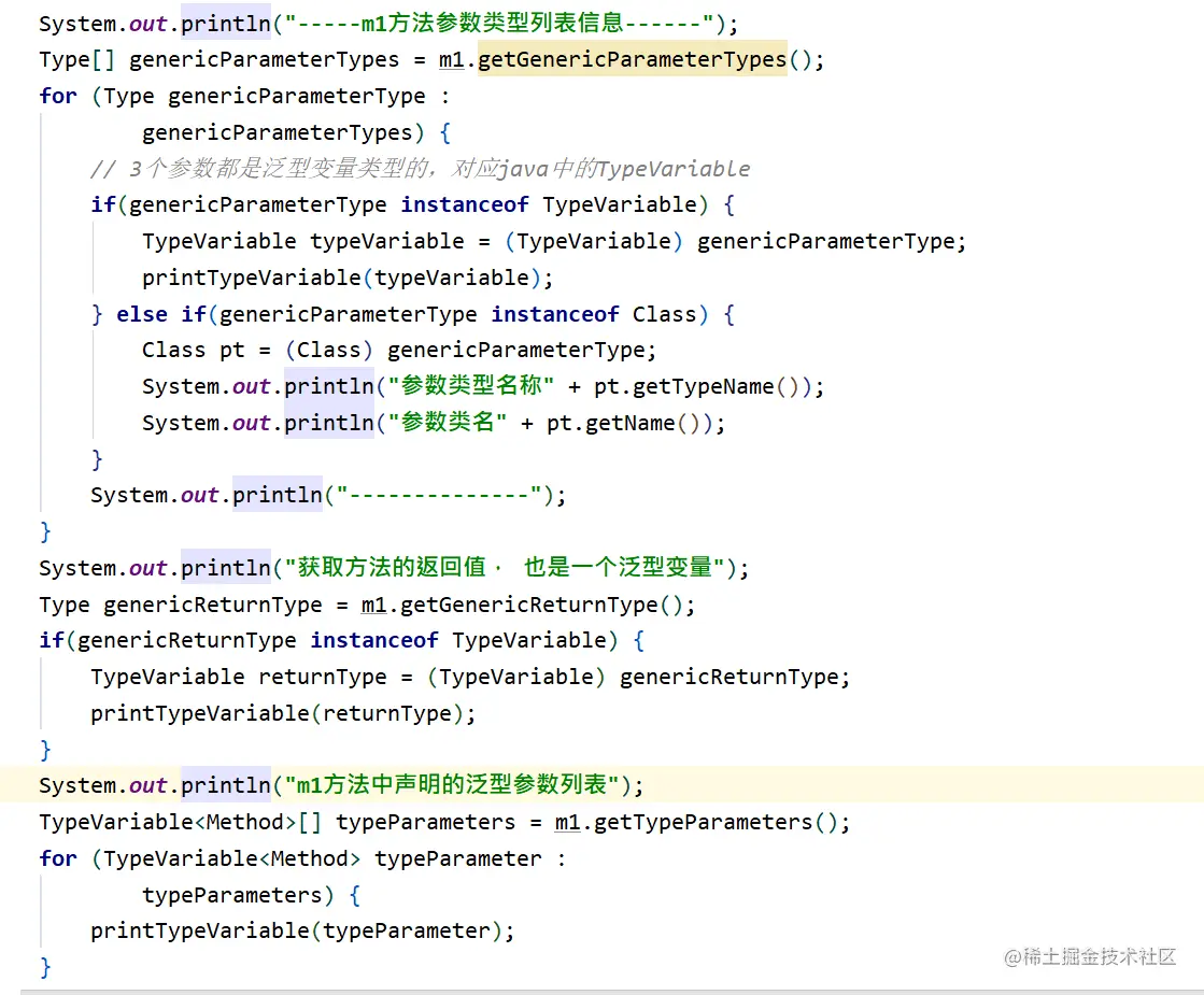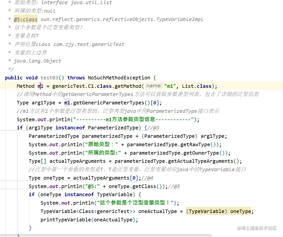 泛型变量类型在java中使用TypeVariable表示,前3个参数都是泛型变量类型的,所以最后他们的信息都可以使用TypeVariable接口获取,最后一个参数是String类型的,这个是非泛型类型,使用Class类型来表示。