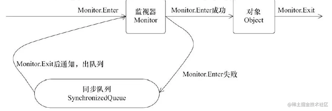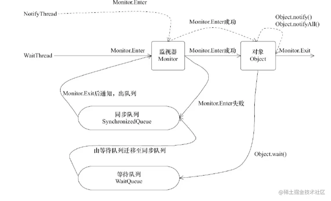 任意线程对 Object(Object 由 synchronized 保护)的访问,首先要获得Object的监视器。如果获取失败,线程进入同步队列,线程状态变为 BLOCKED。当访问 Object 的前驱(获得了锁的线程)释放了锁,则该释放操作唤醒阻塞在同步队列中的线程,使其重新尝试对监视器的获取。