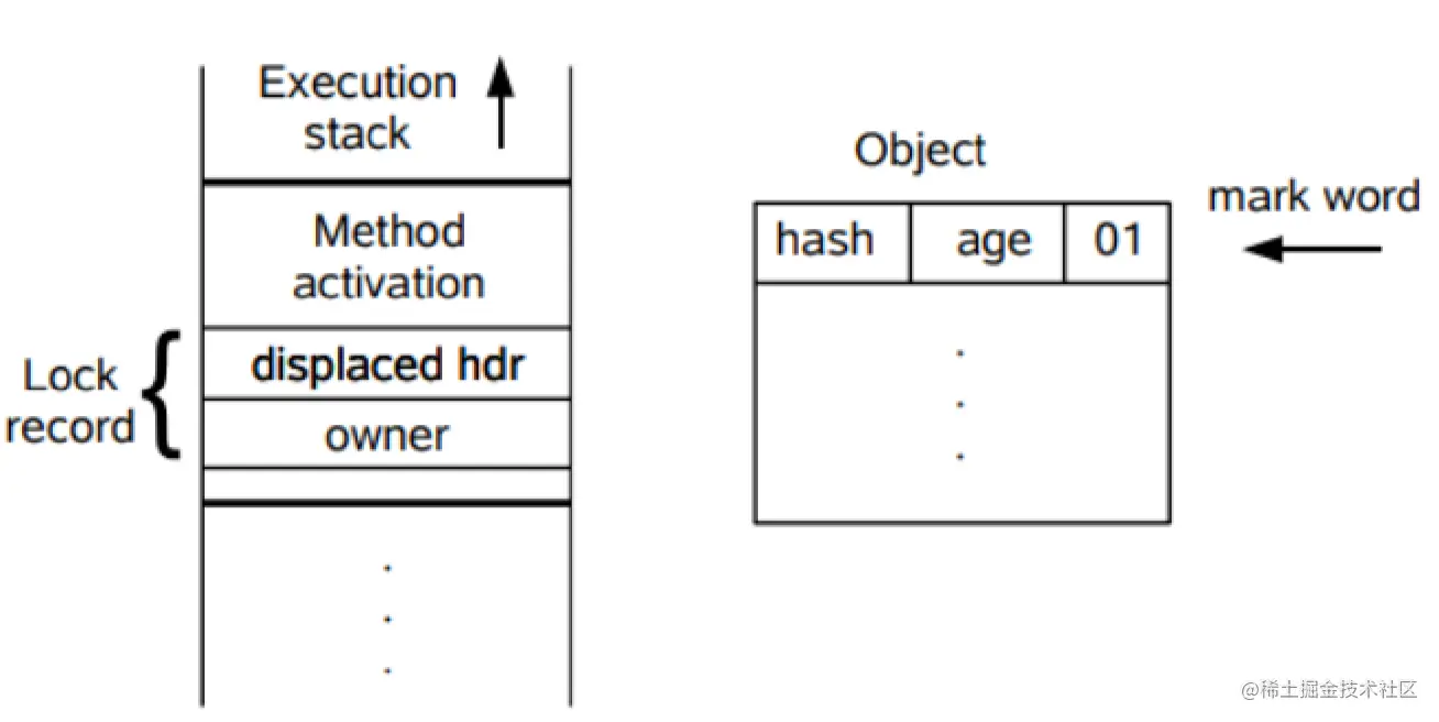 - 将锁对象的对象头的MarkWord替换为指向锁记录的指针。