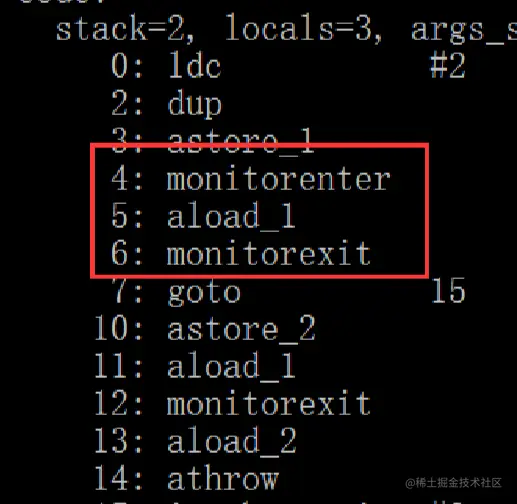 加了同步代码块以后,在字节码中会看到一个 monitorenter和monitorexit。