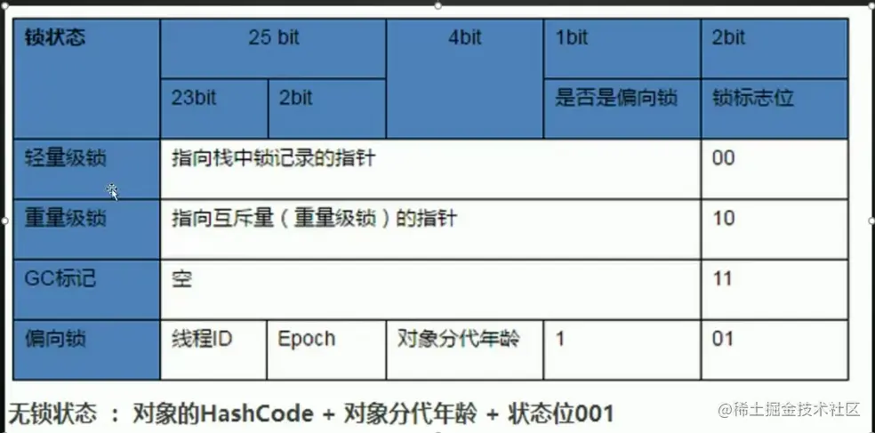 - 锁需要有一个东西来表示,比如获得锁是什么状态、无锁状态是什么状态。